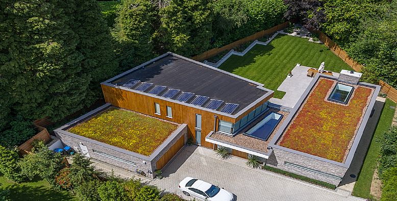 A sustainable contemporary home featuring two green roofs has been constructed with the help of Kemper System.